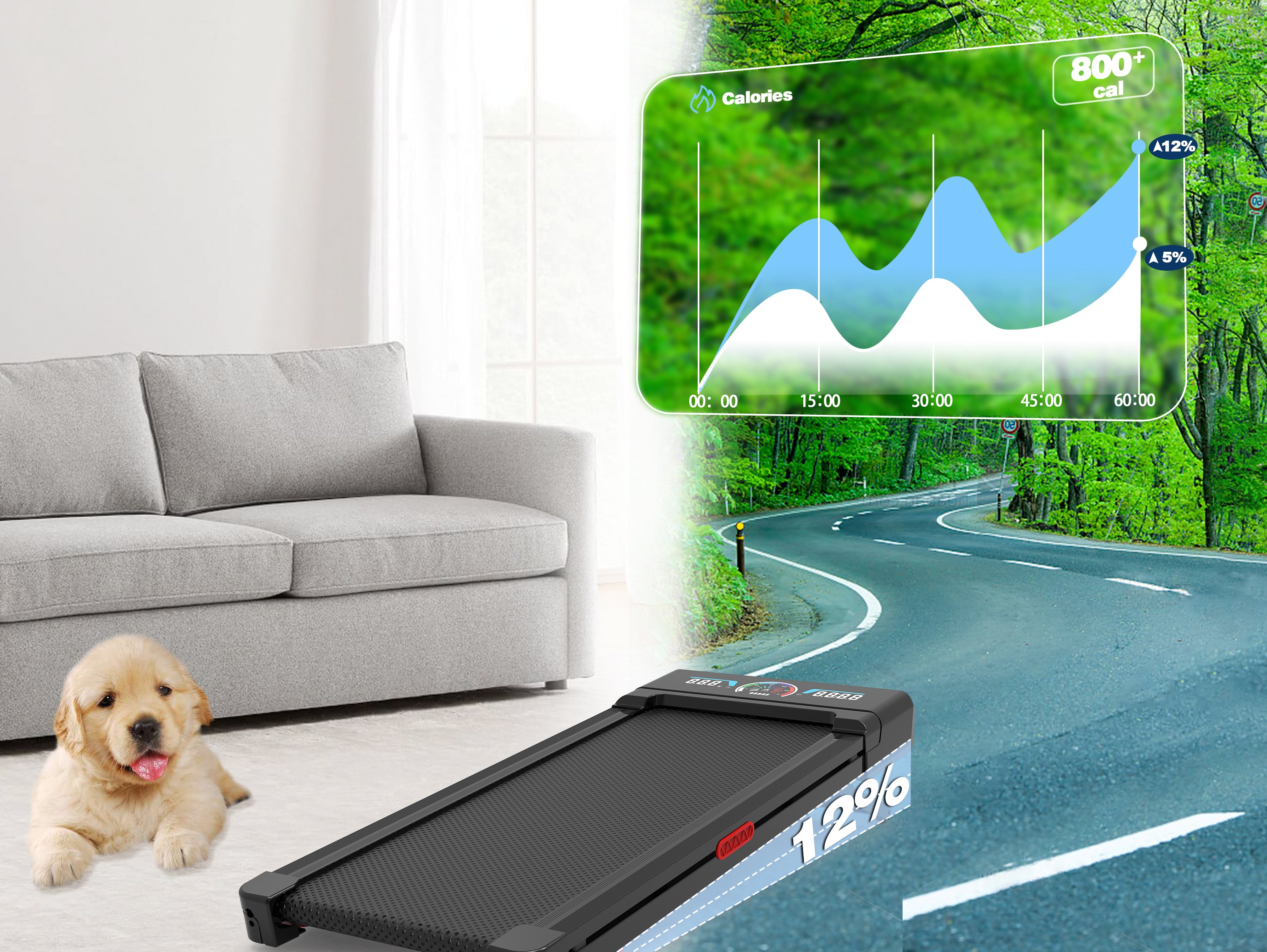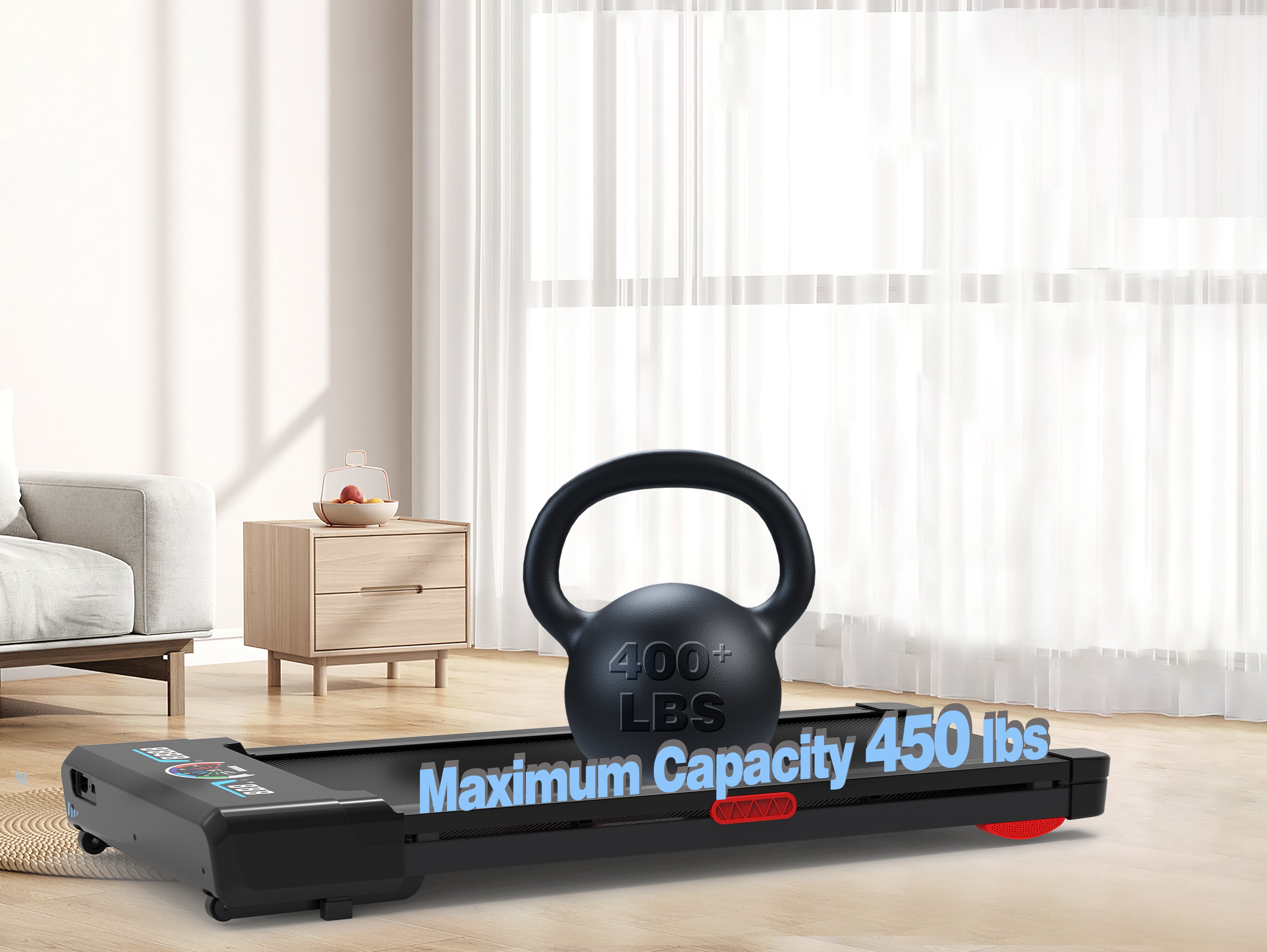 Compact treadmill with 9 levels of auto incline, 450 lb. capacity, cushioned belt, quiet motor, RGB LED screen and portable design. Perfect for efficient home and office workouts.